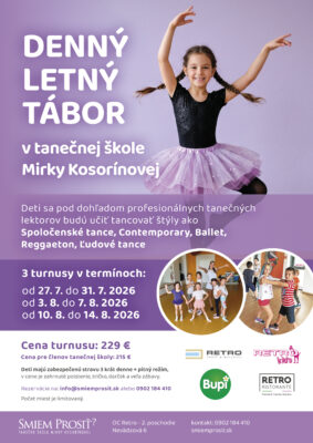Doprajte deťom leto plné pohybu, zábavy a tanca v Tanečnej škole Mirky Kosorínovej „Smiem prosiť?“. Pod vedením profesionálnych lektorov sa naučia rôzne štýly ako spoločenské tance, contemporary, balet, reggaeton či ľudové tance.